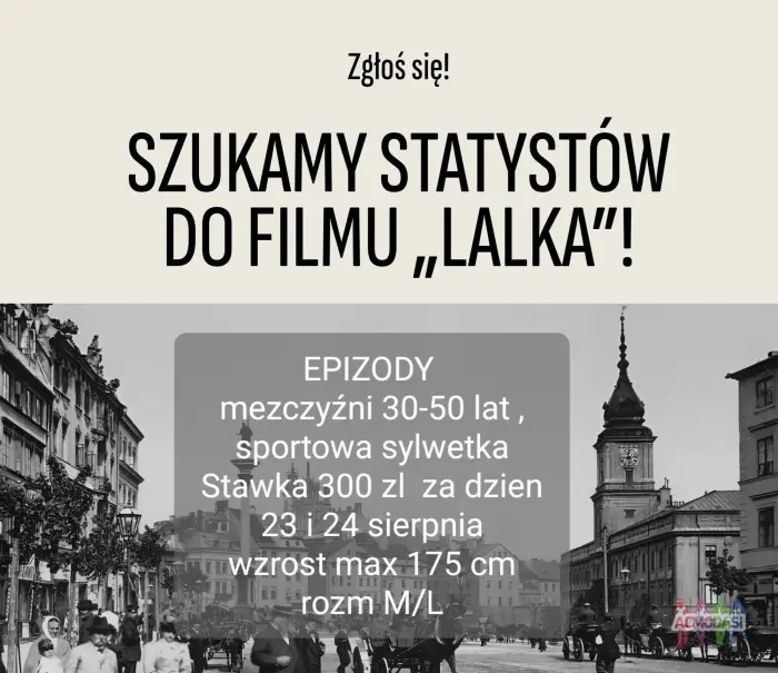 Epizod bez tekstu WROCŁAW film LALKA 23 i 24.08 Stawka 300 zl netto za dzien (za 2 dni lacznie 600zl) Szukamy 6 “trenerów koni” - nie będą mieli kontaktu z końmi bezpośr...